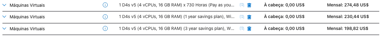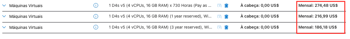 Abaixo usando a Calculadora de Preços do Azure temos uma comparação com modelos PAYG, reserva de 1 ano e reserva de 3 anos: