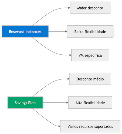 A vantagem do Savings Plan é a flexibilidade, com esse tipo de plano você pode mudar: tipo de VM, região, tamanho de instância. Isso torna o Savings Plan ideal para ambientes com mudanças frequentes, mas o desconto costuma ser menor que o das Reserved Instances.