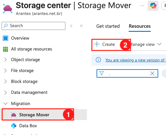 O primeiro passo é criar o Azure Storage Mover que você pode localizar pela barra de pesquisa no portal do Azure ou no Storage Center -> Migration -> Storage Mover e depois + Create como na imagem abaixo: