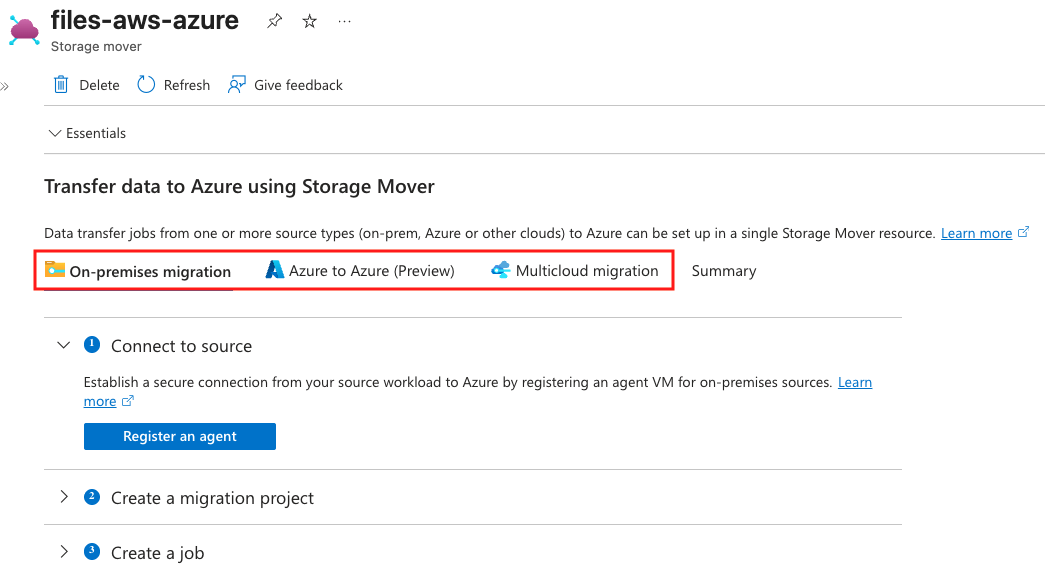 Na tela de Overview além das informações essenciais de todos os recursos Azure temos as opções de como podemos usar o Storage Mover, são essas opções: