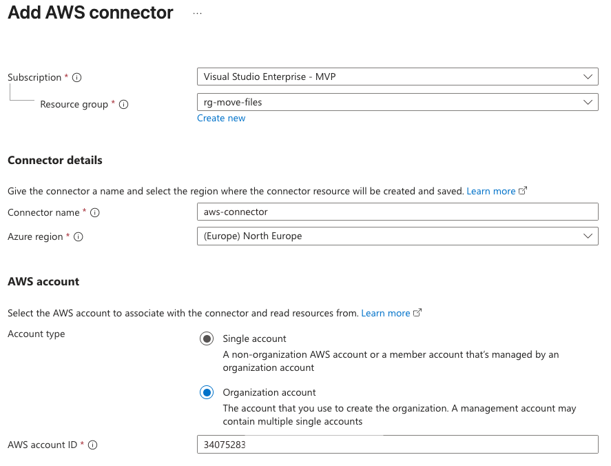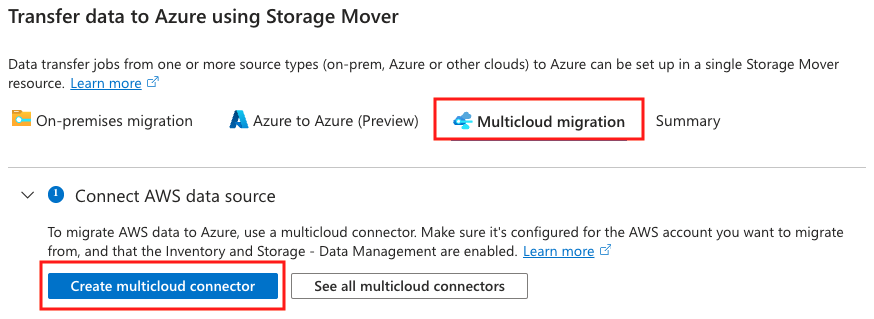 Como iremos fazer uma migração de arquivos da AWS para o Azure devemos selecionar a opção Multicloud migration e após isso clicar na opção Create multicloud connector: