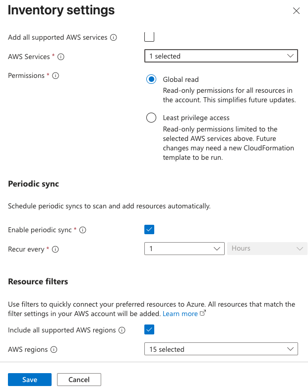 Na tela de Inventory settings escolhemos primeiramente qual serviço iremos adicionar, por padrão vem selecionado todos “AWS Services”, mas como iremos migrar os arquivos a partir de um AWS S3 bucket podemos selecionar somente esse serviço na lista, a permissão podemos escolher Least privilege access para termos acesso somente ao serviço que selecionamos na lista, devemos habilitar ou não o sincronismo automático e o período em horas e por último quais regiões da AWS iremos buscar os S3 buckets: