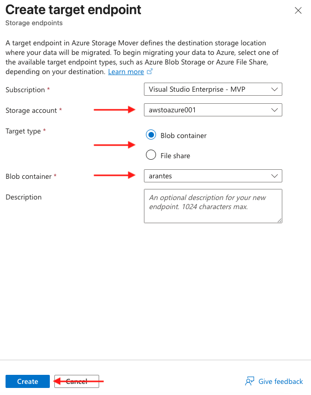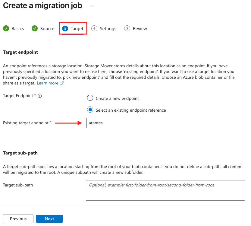 Na aba Target iremos escolher o destino dos arquivos, aqui podemos criar um Target endpoint existente ou criar um, será escolher qual a Azure Storage Account de destino dos arquivos migrados.
