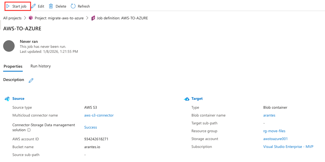 Clicando no recurso criado podemos ver o status Never ran, indicando que o Job definition nunca foi executado, para a primeira execução pode escolher o botão: Start job: