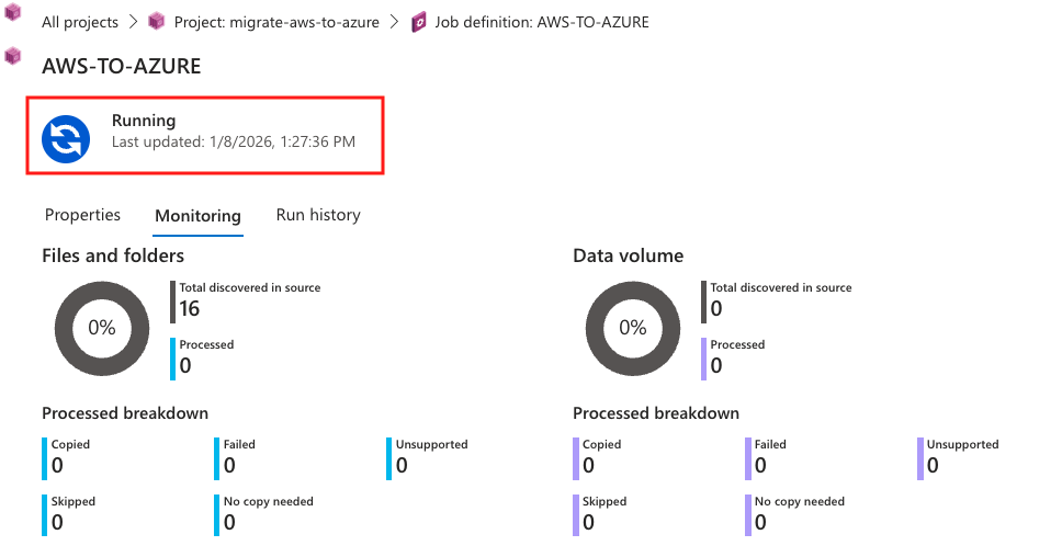 O status é alterado para Running e podemos ver em Files and folders o total de arquivos/pastas que foi detectado na origem (S3 Bucket):