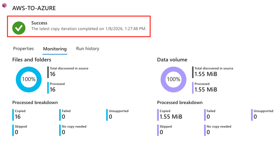 Se tudo correr bem o status passa para Success e podemos ver o resumo da tarefa como a quantidade de arquivos processados e o volume de dados copiados: